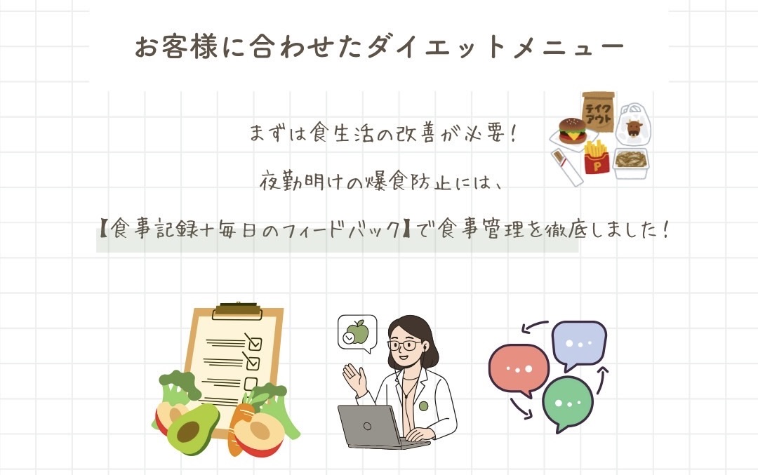 今回のクライアントさんの場合、食事バランスが整っておらず、夜勤明けの爆食いは肥満の大きな原因んびなっている事は明確でした。