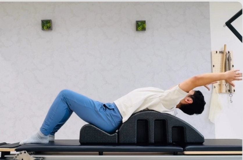 バレル”を使用した胸椎伸展+両手挙上のプレピラティス