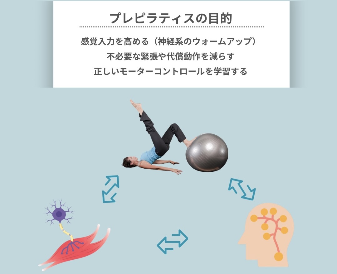 プレピラティスとは、ピラティスエクササイズを行う前に、入れる前座エクササイズ。