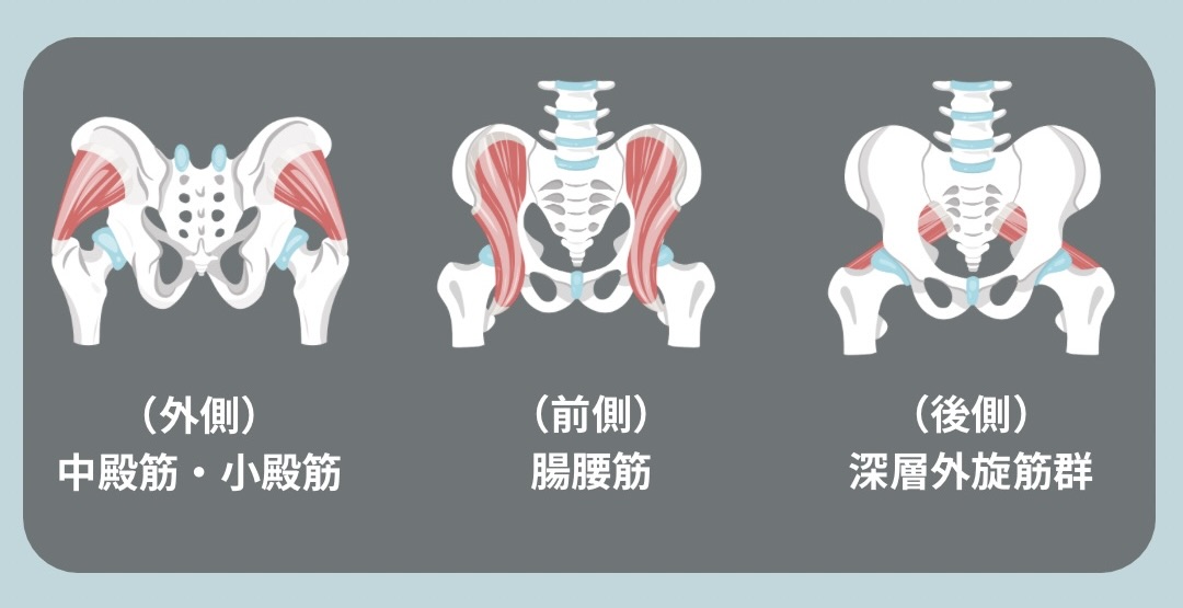 股関節は、前側・外側・後ろからインナーマッスルのサポートによって関節の安定性を生んでいます!