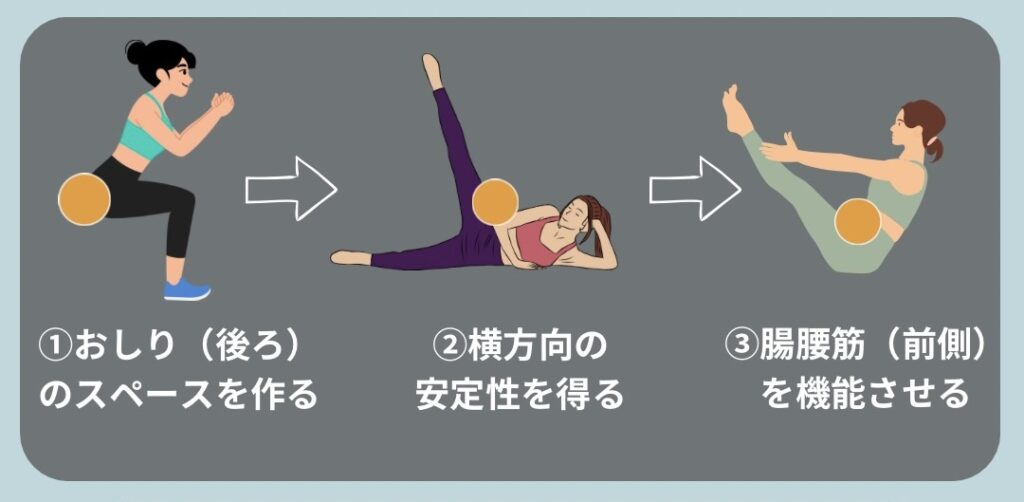 最後に③腸腰筋です。股関節を前側からサポートするメインの筋肉なので、必ず機能させてあげましょう。