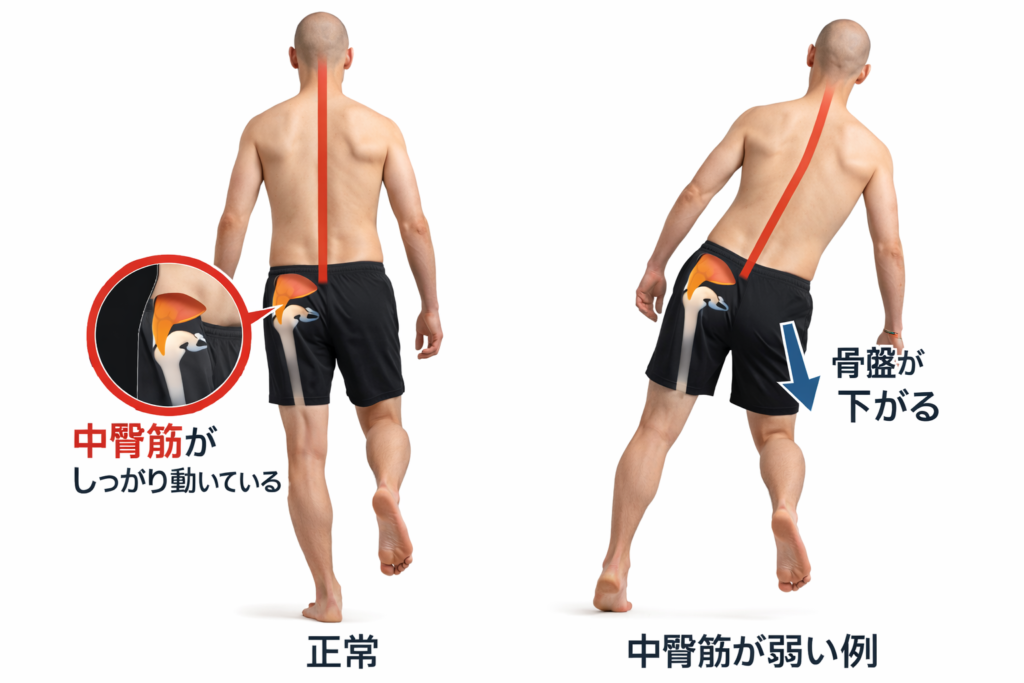 多くの場合、中臀筋(特に後部)の機能不全が背景にあります。