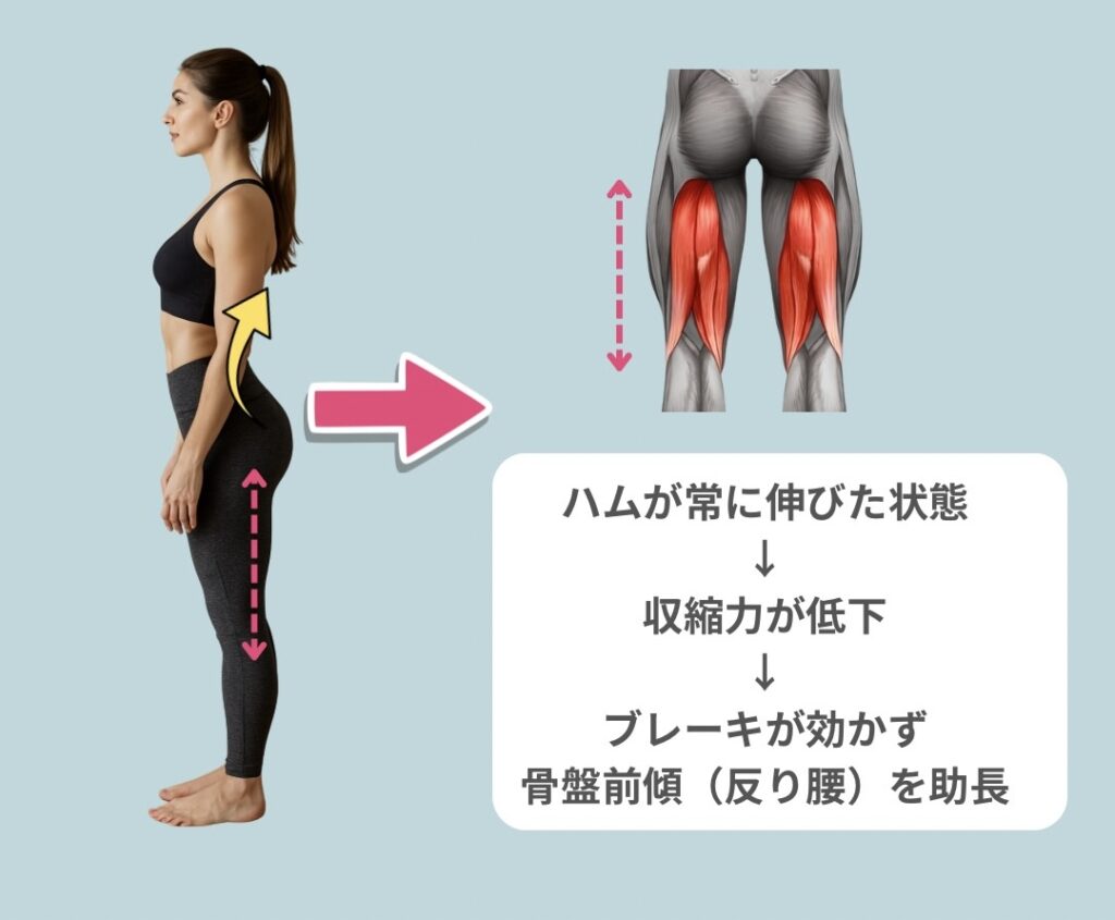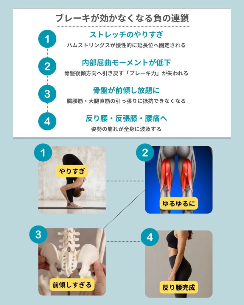 ストレッチのやりすぎ:ハムストリングスが慢性的に延長位へ固定される