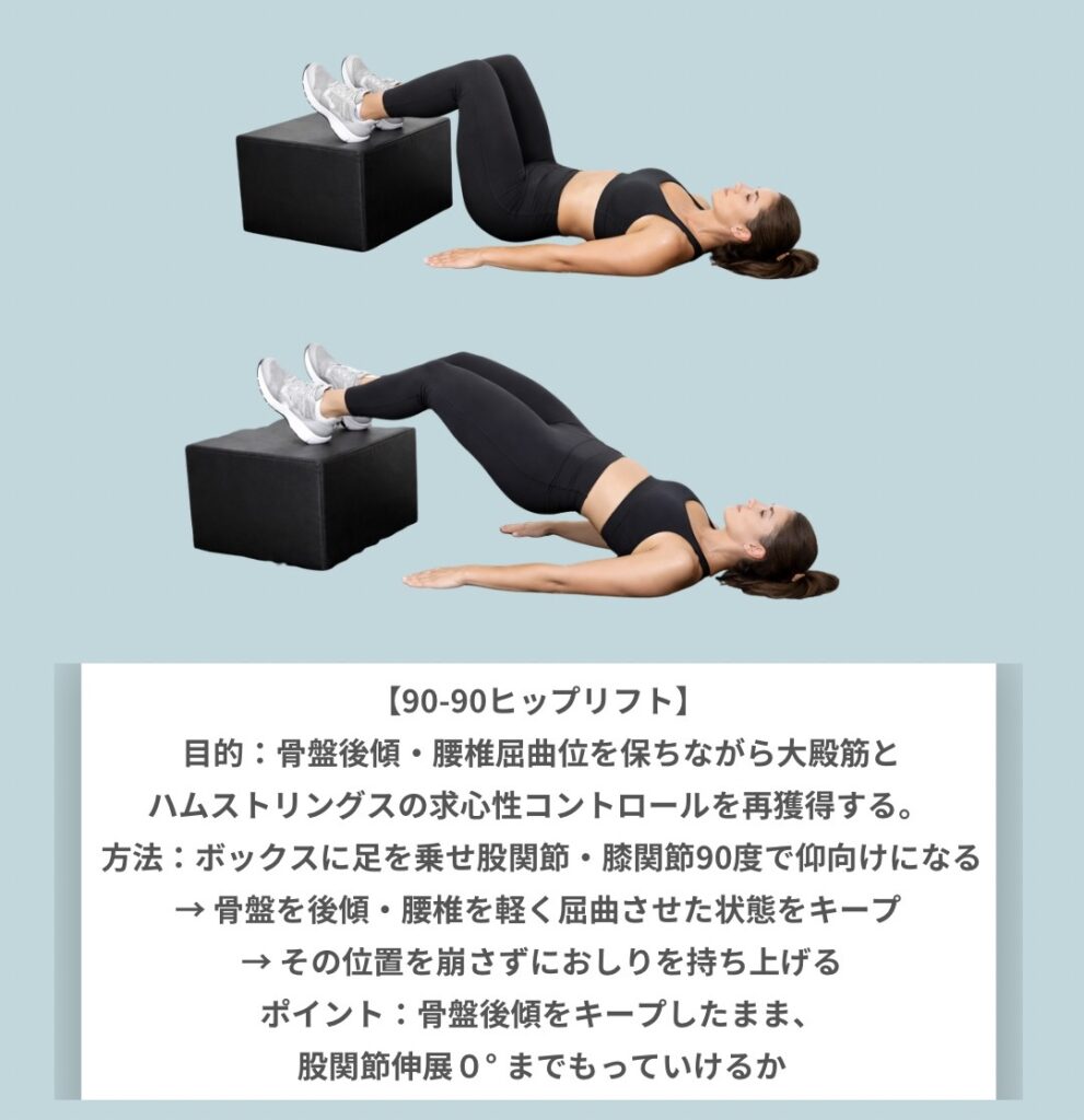 目的:骨盤後傾・腰椎屈曲位を保ちながら大殿筋とハムストリングスの求心性コントロールを再獲得する。